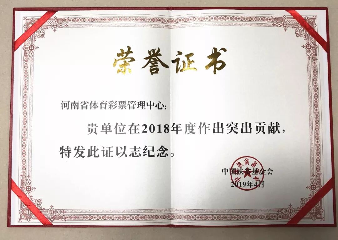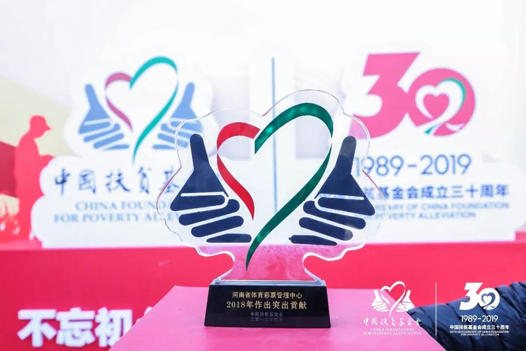 国家体育总局体育彩票管理中心和河南省体育彩票管理中心被中国扶贫基金会授予“2018年度突出贡献奖”。