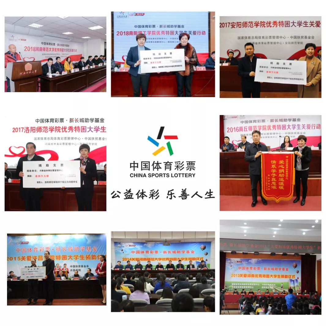河南省体育彩票管理中心自2013年开始,已经连续6年通过国家体育总局体育彩票管理中心与中国扶贫基金会合作,以“中国体育彩票·新长城助学基金”形式,向信阳师范学院、河南师范大学、许昌学院、商丘师范学院、周口师范学院、洛阳师范学院、安阳师范学院、南阳理工学院共计8所院校的520名优秀贫困大学生进行了资助。此项活动还在持续开展,希望能帮助更多的困难学生及其家庭减轻经济负担和精神压力。