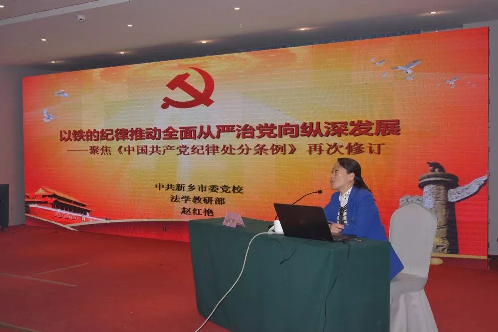 最后在课堂教学中,新乡市委党校赵红艳老师以《以铁的纪律推动全面从严治党向纵深发展》为题为学员们解读了最新一次修订的《中国共产党纪律处分条例》。她从条例的修改背景、重点内容和如何践行《条例》这三个方面进行了详细的论述,使大家深刻理解了《条例》的意义和修订后的变化的主要内容。《条例》的修订适应了新时代建设的总体要求,进一步扎紧了管党治党的制度笼子,为推动全面从严治党向纵深发展提供了坚强的纪律保障。