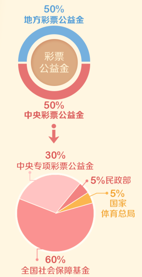 其中彩票公益金的来源分为两部分:一部分按照国家规定比例从彩票销售资金中筹集,一部分是逾期未兑奖的奖金。